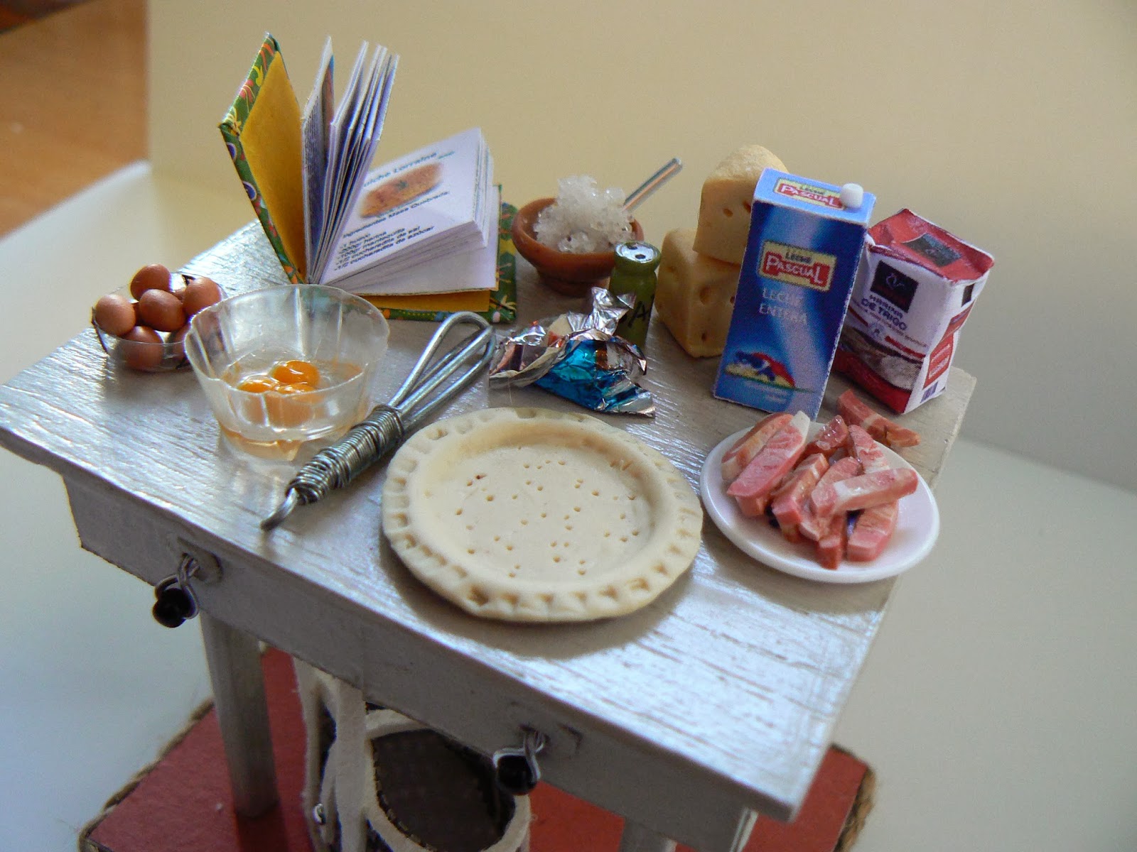 Empiezo por las mesas. Son cinco y como es costumbre en mi todo hecho con mis manitas.En cada una hay un libro de recetas de cocina que si bien el contenido es el mismo para todos, las tapas son distintas. El libro está abierto en cada una por la receta que se representa. También están los ingredientes necesarios para preparar dicha receta, estás son auténticas y si se quiere solo se tiene que usar una lupa para poder seguirla.
