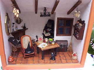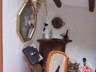 En el rincón de la chimenea además del caldero preparado para hacer pócimas hay un quinqué un tronco de árbol con una vela negra y un jarrón con una rosa también negra. En la pared de la izquierda hay un gran cuadro, es de la bruja de Blancanieves con su espejo mágico, está en un lugar de honor porque era una antepasada de mi bruja. Debajo está su libro de hechizos en un atril. El libro tiene un ojo que todo lo ve, igual que el de la película El retorno de las brujas.